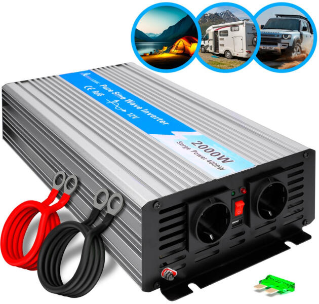 Extralink OPIP-2000W tiszta szinuszos feszültségátalakító Az Extralink OPIP-2000W feszültségátalakító egy olyan eszköz, amely az akkumulátor kimeneti feszültségét (egyenáram, DC) 230 V váltóárammá (váltóáram) alakítja át. A 230 V AC az a fajta áram, amelyet a közművek szabványos háztartási készülékek, például TV, hűtőszekrény, rádió, világítás vagy laptop/mobiltelefon töltésére biztosítanak. Ha már van feltöltött akkumulátora, akkor az inverter csatlakoztatása lehetővé teszi a háztartási készülékek áramellátását olyan területeken, ahol nincs hozzáférés az elektromos hálózathoz; például lakóautóban, lakókocsiban, csónakban, telephelyen vagy más távoli helyen. Az inverterek ideálisak a hálózaton kívüli rendszerekhez és a tartalék áramellátási rendszerekhez is véletlen áramkimaradás esetén. Ez egy tiszta szinuszos inverter, ami azt jelenti, hogy a 230 V váltakozófeszültség kimenet harmonikusan követi a sima szinuszhullámot, és szinte teljesen megegyezik a hagyományos villamos hálózattal. A tiszta szinuszhullám sokkal alkalmasabb berendezések működtetésére, mint a négyszögjel vagy a módosított szinuszhullám. Szinuszos inverter előnyei: