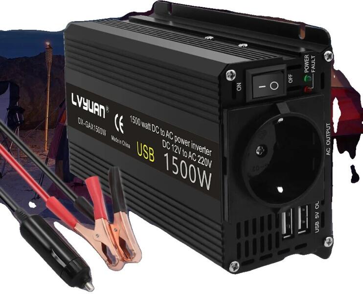 1500W DC 12V - AC 220V Inverter USB töltéssel - Konvertáld az autód energiáját! ?⚡️ Ez az inverter ideális megoldás, ha útközben szeretnél elektromos eszközöket használni, vagy ha áramszünet esetén szükséged van egy megbízható áramforrásra. Könnyedén alakítsd át a 12V-os egyenáramot 220V-os váltóárammá, és töltsd eszközeidet USB-n keresztül! Főbb jellemzők:Hatékony energiaátalakítás: DC 12V-ról AC 220V-ra alakítja az áramot. Teljesítmény: 1500W csúcsteljesítmény (750W folyamatos teljesítmény). USB töltőport: Kényelmesen töltheted telefonodat, tabletedet és más USB-s eszközeidet. Módosított szinuszhullám: Alkalmas a legtöbb háztartási eszközhöz. Kompakt és hordozható: Könnyen szállítható és tárolható. Biztonsági funkciók:8 féle védelem: Fordított polaritás, alacsony/magas feszültség, túláram, rövidzárlat, hőmérséklet, túlterhelés elleni védelem. Beépített biztosítékok: További biztonságot nyújtanak. Műszaki adatok:Jellemző ÉrtékBemeneti feszültség DC 12VKimeneti feszültség AC 220VCsúcsteljesítmény 1500WFolyamatos teljesítmény 750WUSB kimenet IgenFrekvencia 50Hz ± 2HzHatékonyság >90%Használati tippek: Ideális kempingezéshez, autós utazásokhoz és sürgősségi áramforrásként. A mellékelt szivargyújtó csatlakozóval könnyedén csatlakoztathatod az autóhoz. Élvezd a szabadságot, hogy bárhol és bármikor használhatod elektromos eszközeidet ezzel a sokoldalú inverterrel! ?️