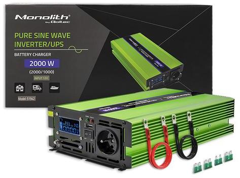 Qoltec Monolith tiszta szinuszhullámos Inverter | Akkumulátortöltő | UPS | 1000W | 2000W | 12V - 230V | LCD (QC-51942)